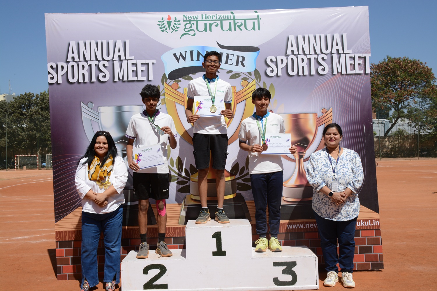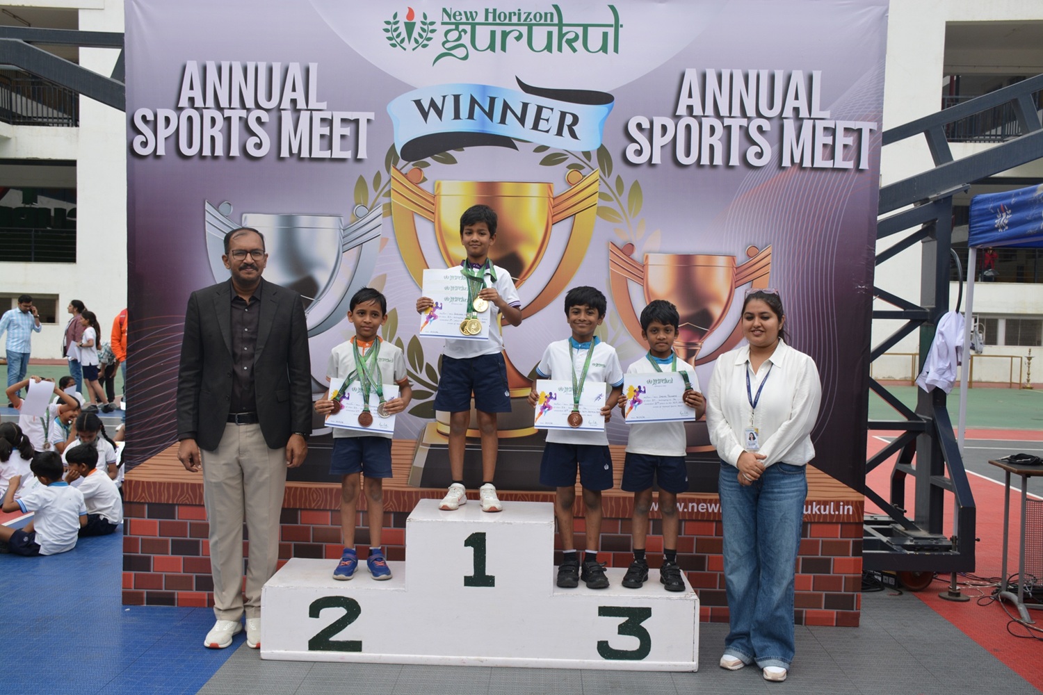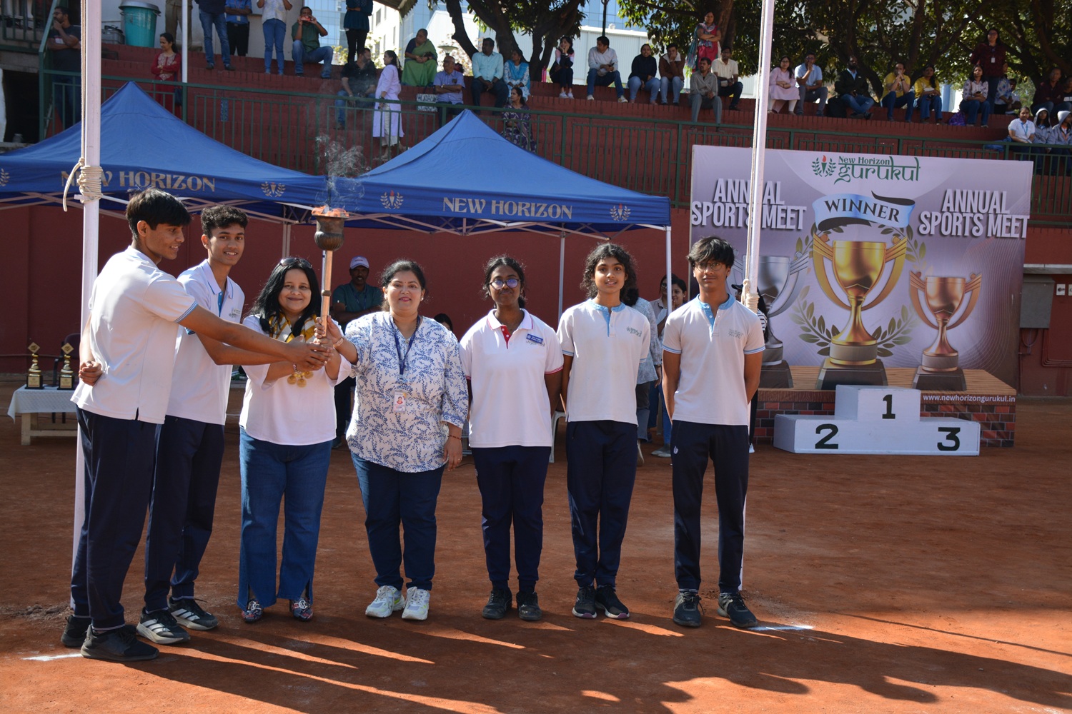 The Annual Sports Meet at New Horizon Gurukul is a grand celebration of fitness, teamwork, and determination. The event begins with an energetic march-past, torch-lighting ceremony, and an inspiring address by the chief guest. Students participate in a variety of track and field events, showcasing their athletic talents and house spirit.